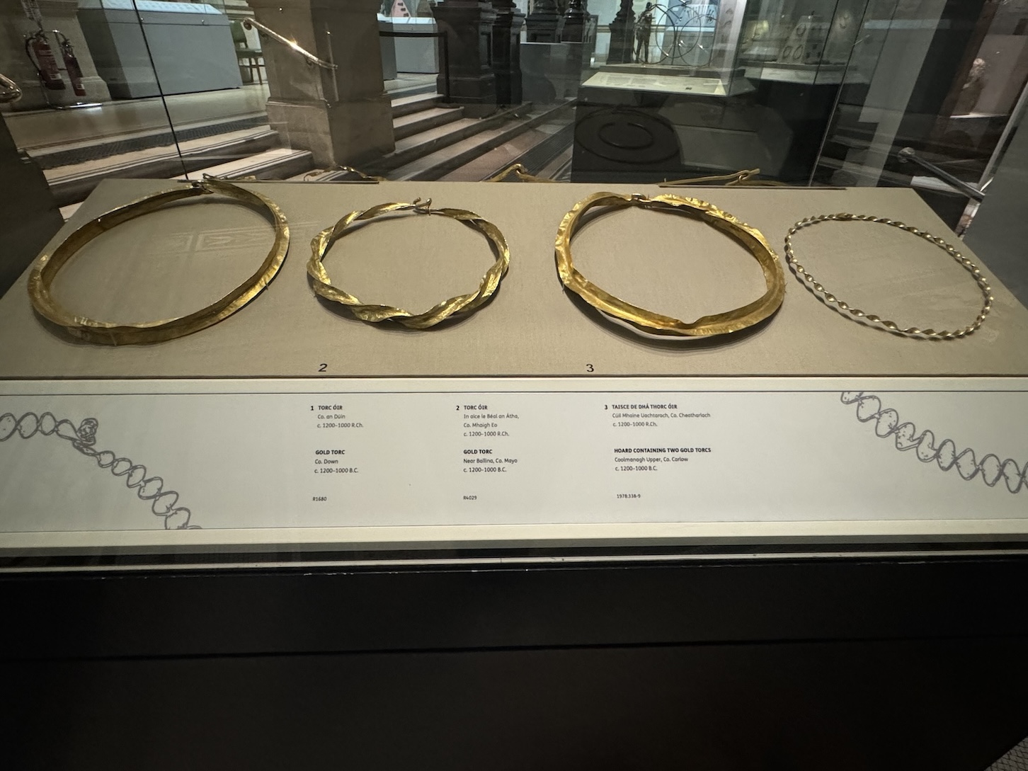 The museum’s interpretative signs explain that the Iron Age produced fewer golden relics than the Bronze Age, but those that were produced in the Iron Age required proficient skill. Ribbon “torcs” were the most common pieces of this period and are found only in Ireland and Scotland. To create a ribbon torc, metal strips were beaten flat and then stretched and twisted to create a delicate spiral shape.