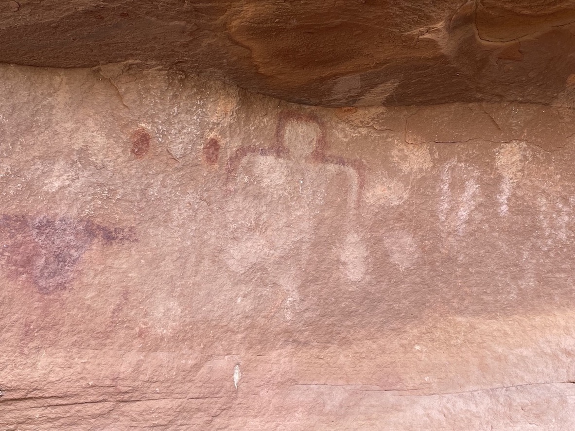 There are Native American petroglyphs (carvings) and pictographs (drawings) all throughout the desert Southwest. Many of them are featured on accessible and famous trails, so it doesn’t take a lot of effort to find them. In Southern Utah, one such site is the Potash Road dinosaur tracks and petroglyphs just off the road near Moab. Others are less conspicuous and require dedicated sleuthing to search them out. That’s where the fun lies!