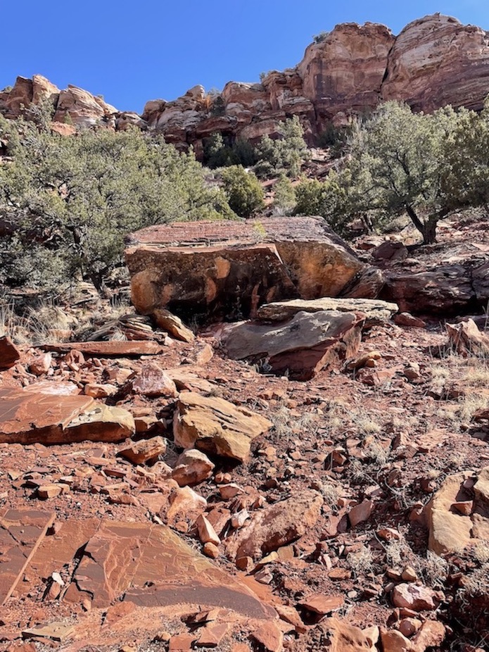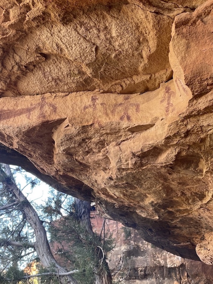 There was no trail to the petroglyph site in the gallery above, so I needed to scale a mountainside near Colorado City looking for coordinates. It was extremely rewarding to find the cliff dwelling under a rocky overhang alongside glyphs depicting people, animals, and dozens of baskets. Can you see the bow and arrow?