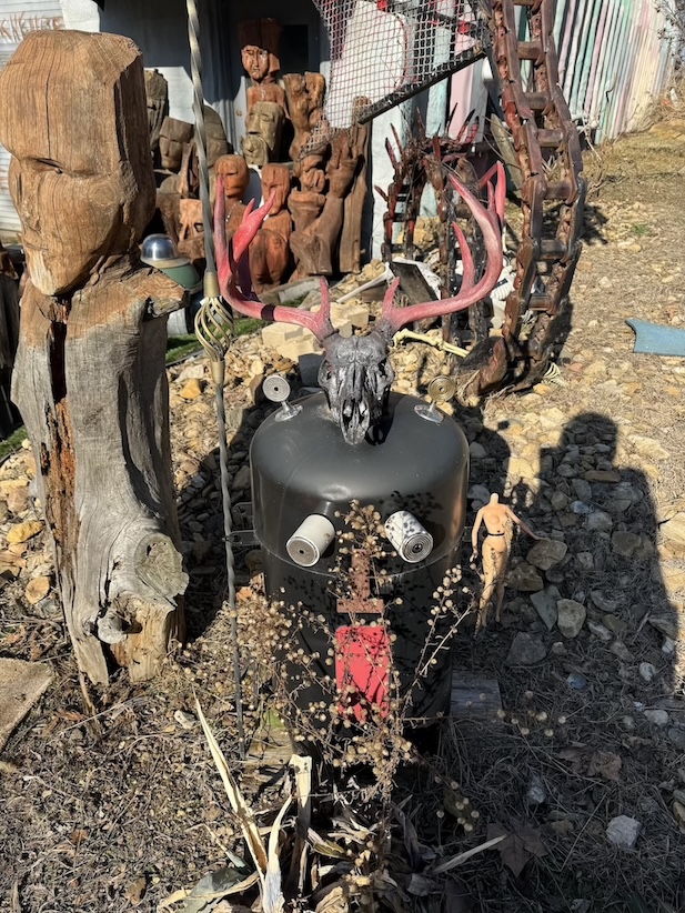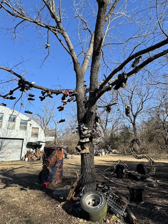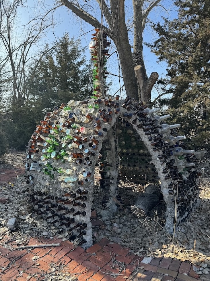 That was how Linda described her husband Ron Lessman when she gave me the rundown on what to expect while exploring the grounds of their home in Topeka, Kansas. I was sold on the site long before that, though. Upon entering their driveway, visitors are instructed by a stop sign to wait and honk in order to beckon the owner to come out and greet you. While I waited, two peacocks ambled across the driveway in front of me.