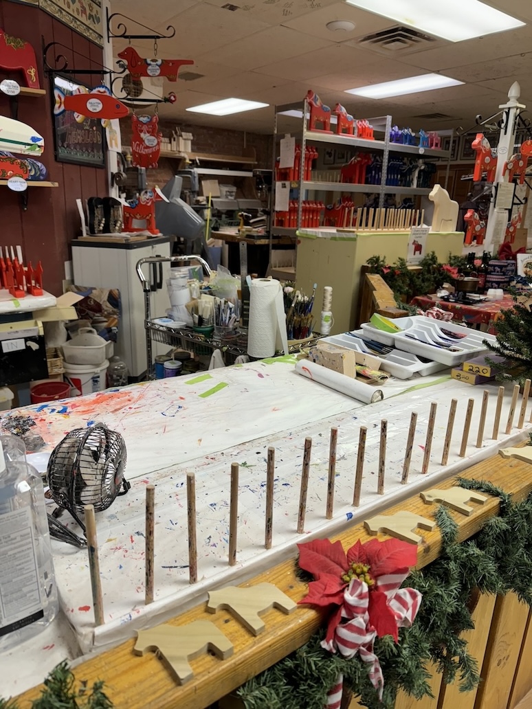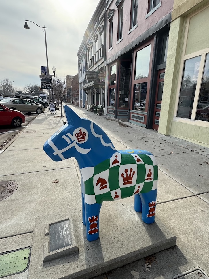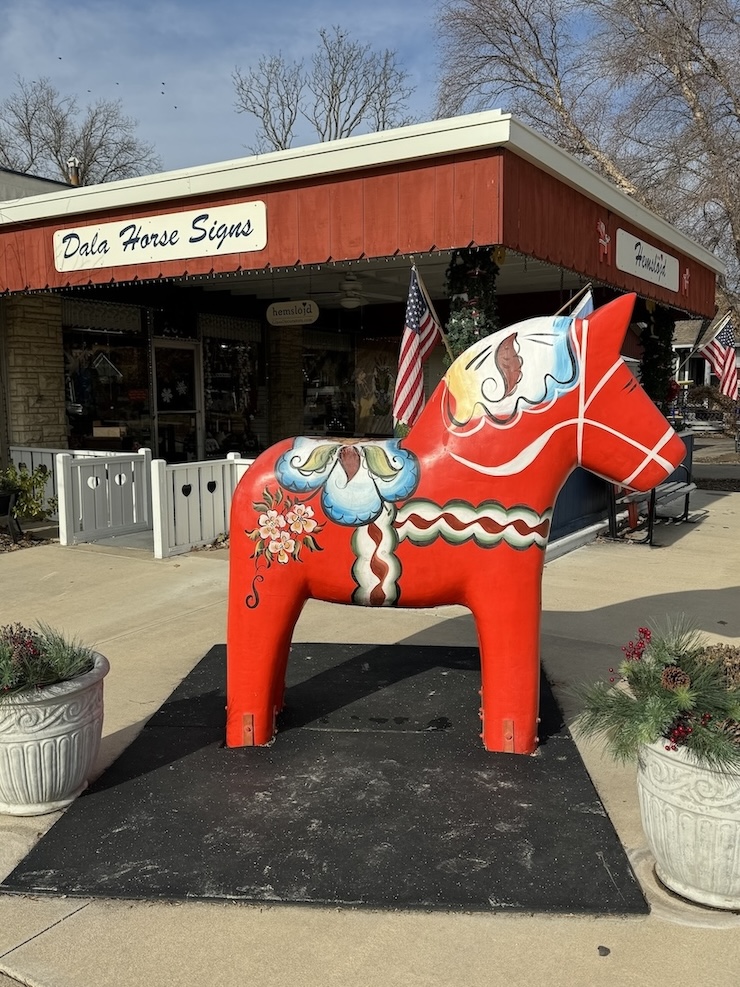 Lindsborg, Kansas was settled by Swedish immigrants in 1869 and their heritage is still celebrated there today. Some of the most prominent markers of Swedish influence in Lindsborg are the many wooden craft Dala horses that decorate the main shopping street and local porches. Tourists can purchase them as souvenirs and watch them being made at Hemslöjd Swedish Gifts.