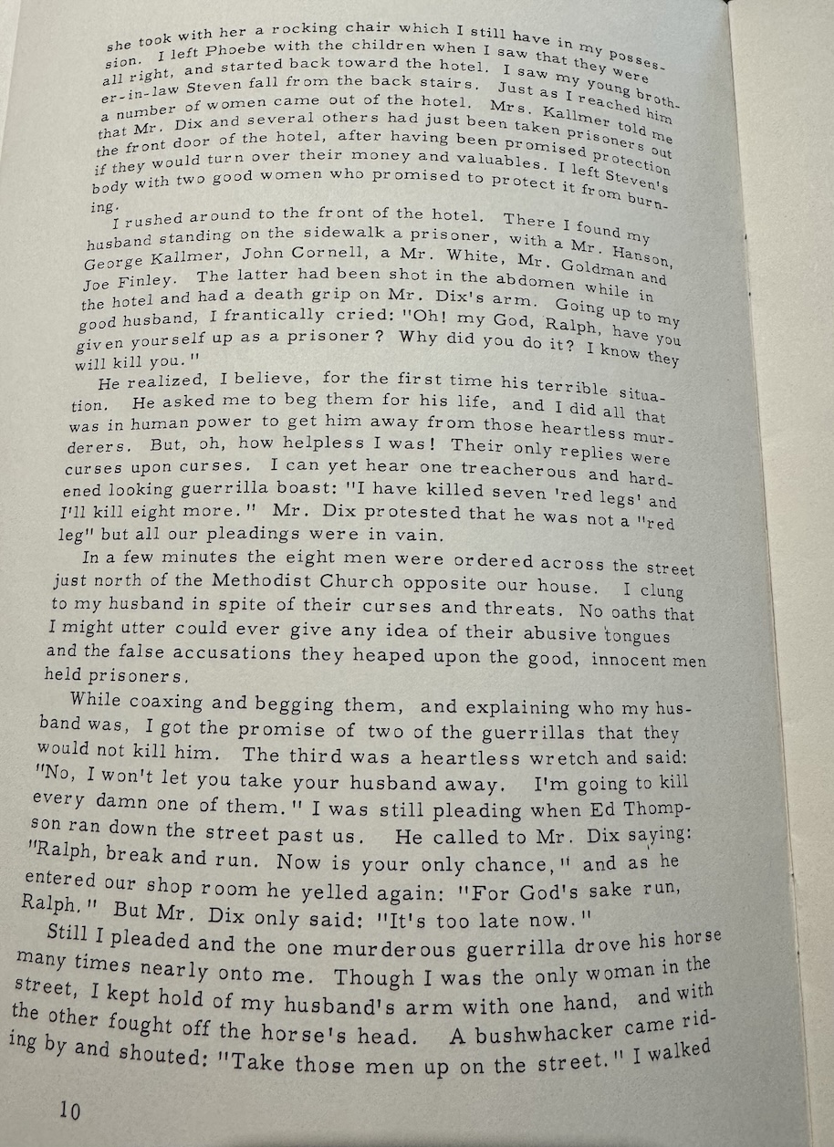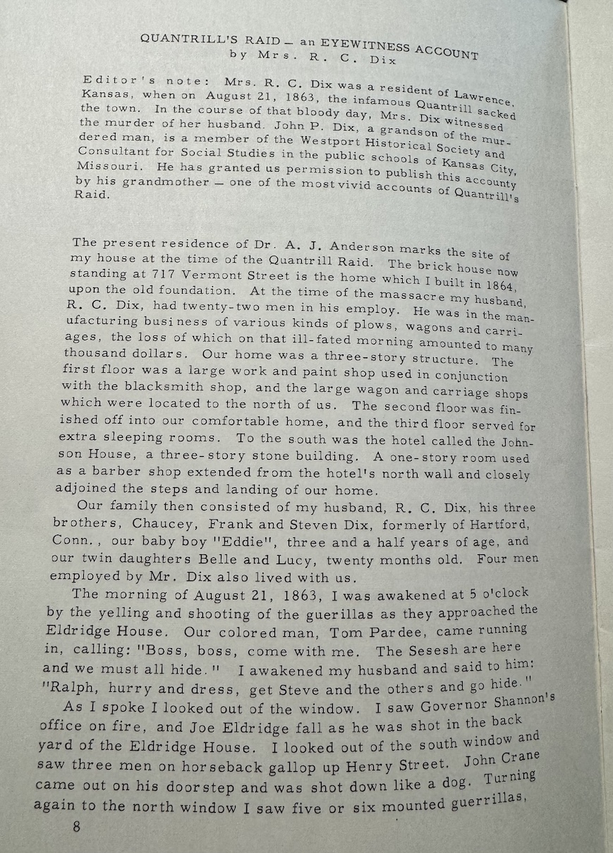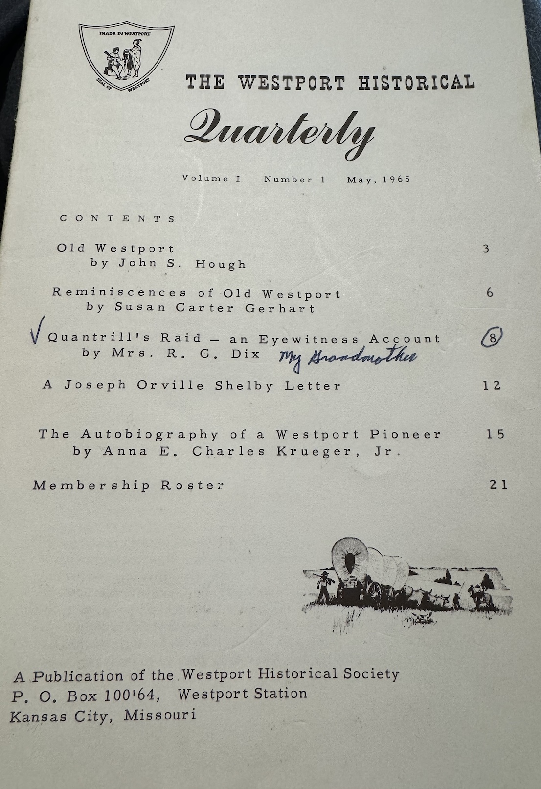 My great-great-great grandfather was murdered in Quantrill’s Raid. His name is listed amongst the victims in this newspaper clipping from 1863. His widow wrote an eyewitness account of the raid for The Westport Historical Quarterly, Volume 1, Number 1 in 1965, which my family has a copy of. Read her story in the photos above. If her young children had not been saved, particularly little Eddie, I wouldn’t be here today.