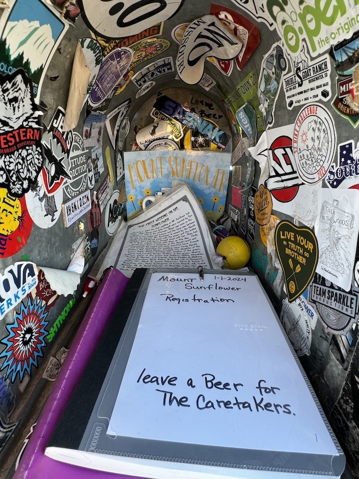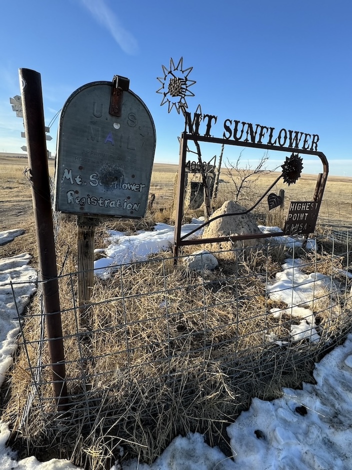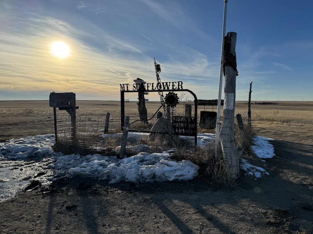 Peakbaggers who make an effort to summit the highest natural points in every state will be relieved to find that they can simply drive to Mount Sunflower in Kansas. It sits at 4,039ft, which may sound significant, but the surrounding flatlands look to be about 4,038.5ft in every direction. The state of Kansas gradually rises in elevation from east to west, and sitting at the border with Colorado, “Mount” Sunflower is as far west as you can get.