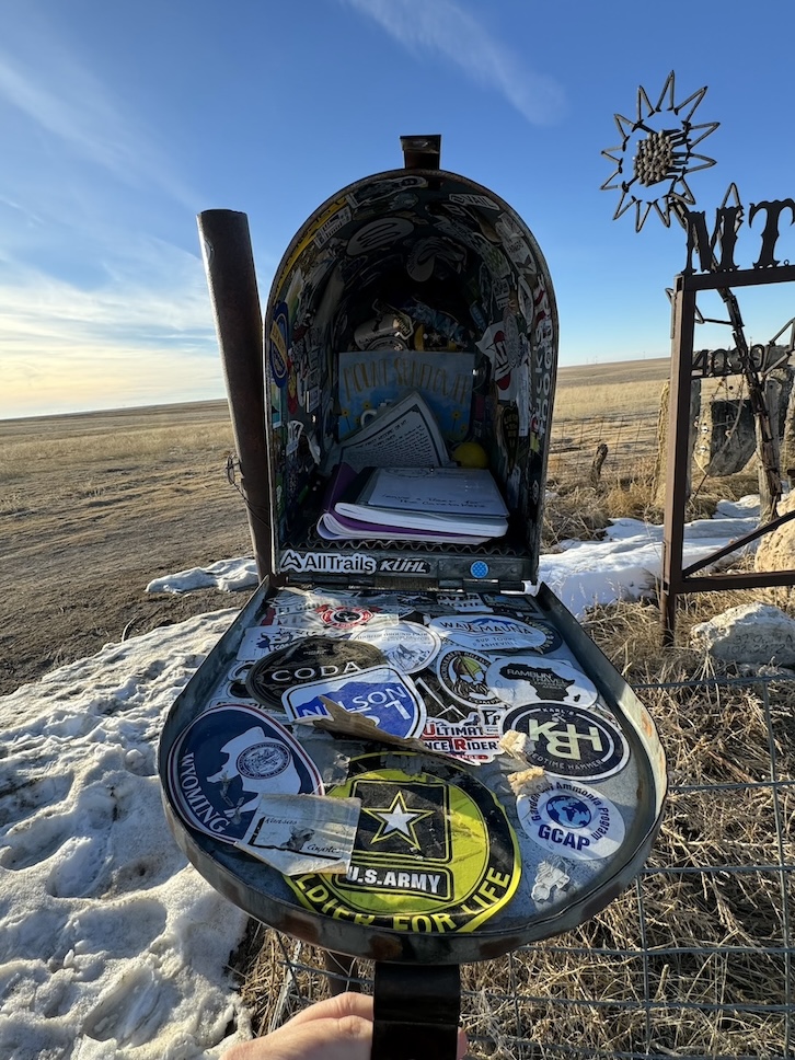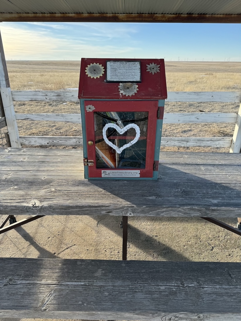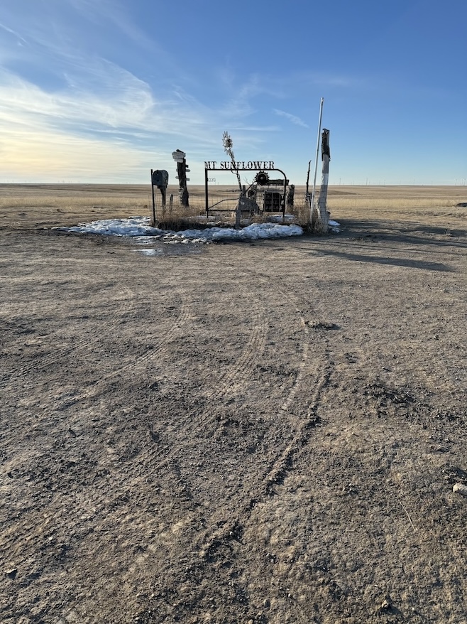 Mount Sunflower is on private land, but the owners allow visitors. From the Welcome to Kansas sign on US-40 E, you’ll drive on dirt roads for about 13 miles to reach it. In winter, these rutted roads may be slushy from snow; four wheel drive could be useful. You’ll know you’ve arrived at the monument by the tall metal sunflower sculpture surrounded by a fence. There’s also a signpost showing the mileage to faraway places like Stockholm, Sweden, and Bigfork, Montana, and closer destinations like Holcomb, Kansas. Open the mailbox onsite to find a guest logbook where you can write your name and the date, and trade books via the honor system at the “little library” on the picnic table.