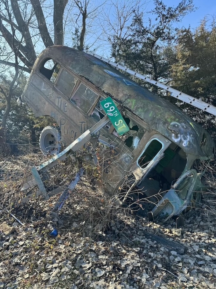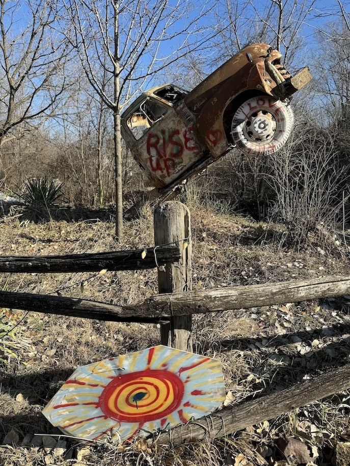 You can either drive the path or park and walk; I opted to walk so I could better take in all the little details. Entrance to Truckhenge is free, but an ice cream carton hanging down from the porch on a string serves as a receptacle for donations.