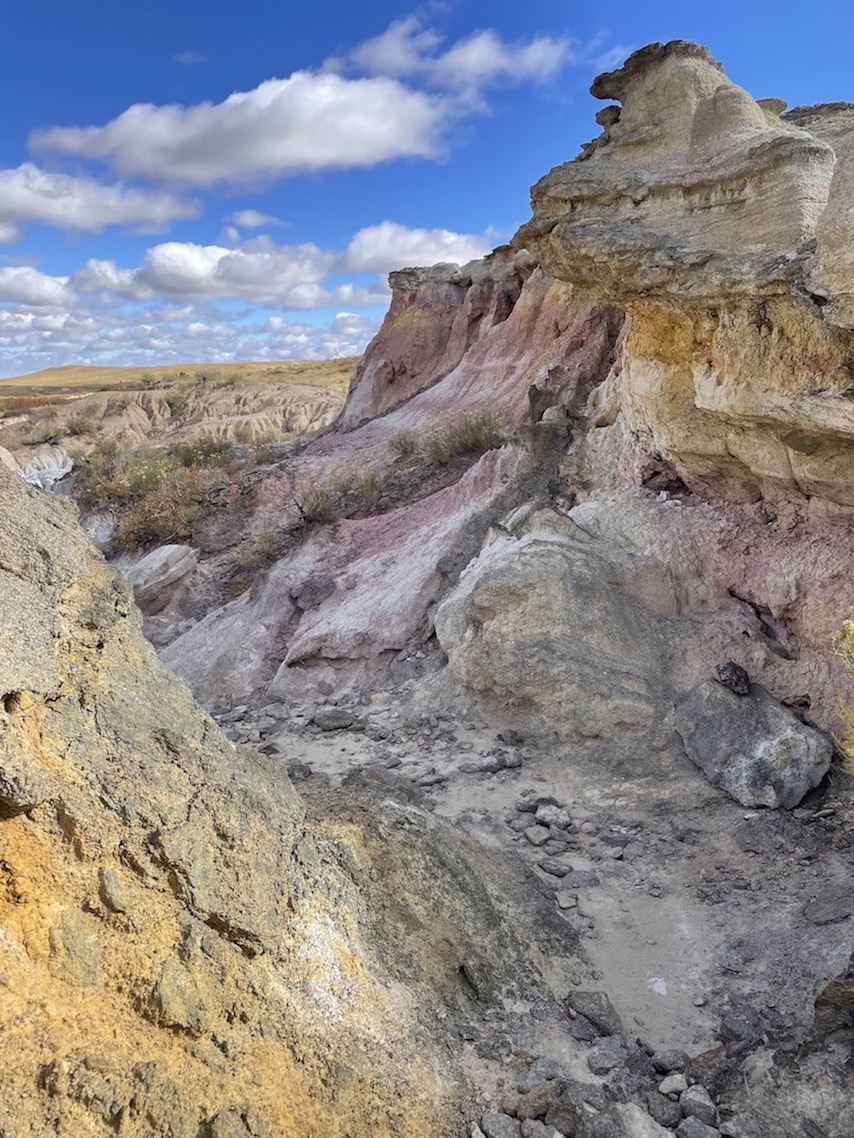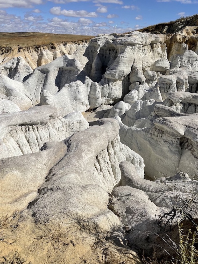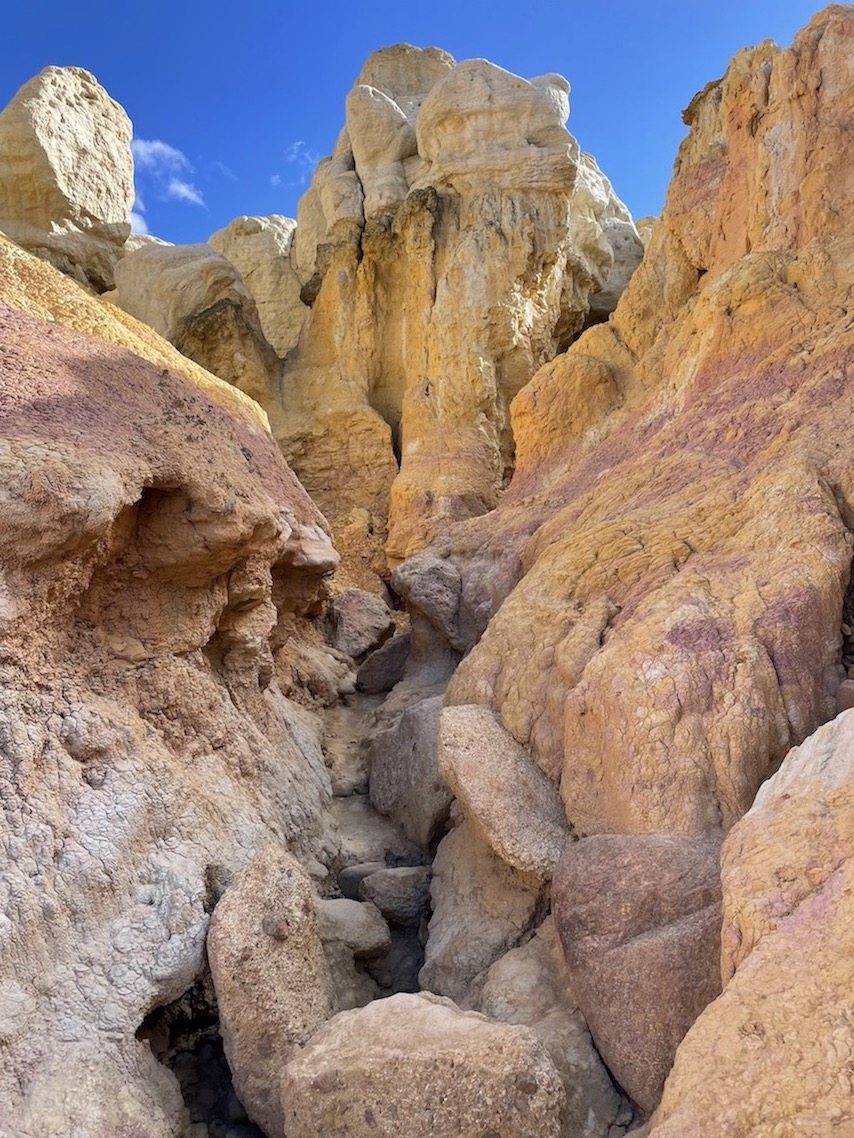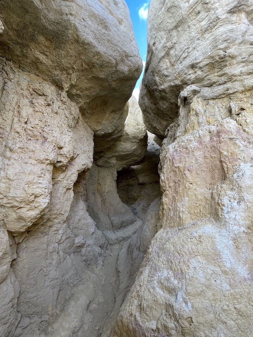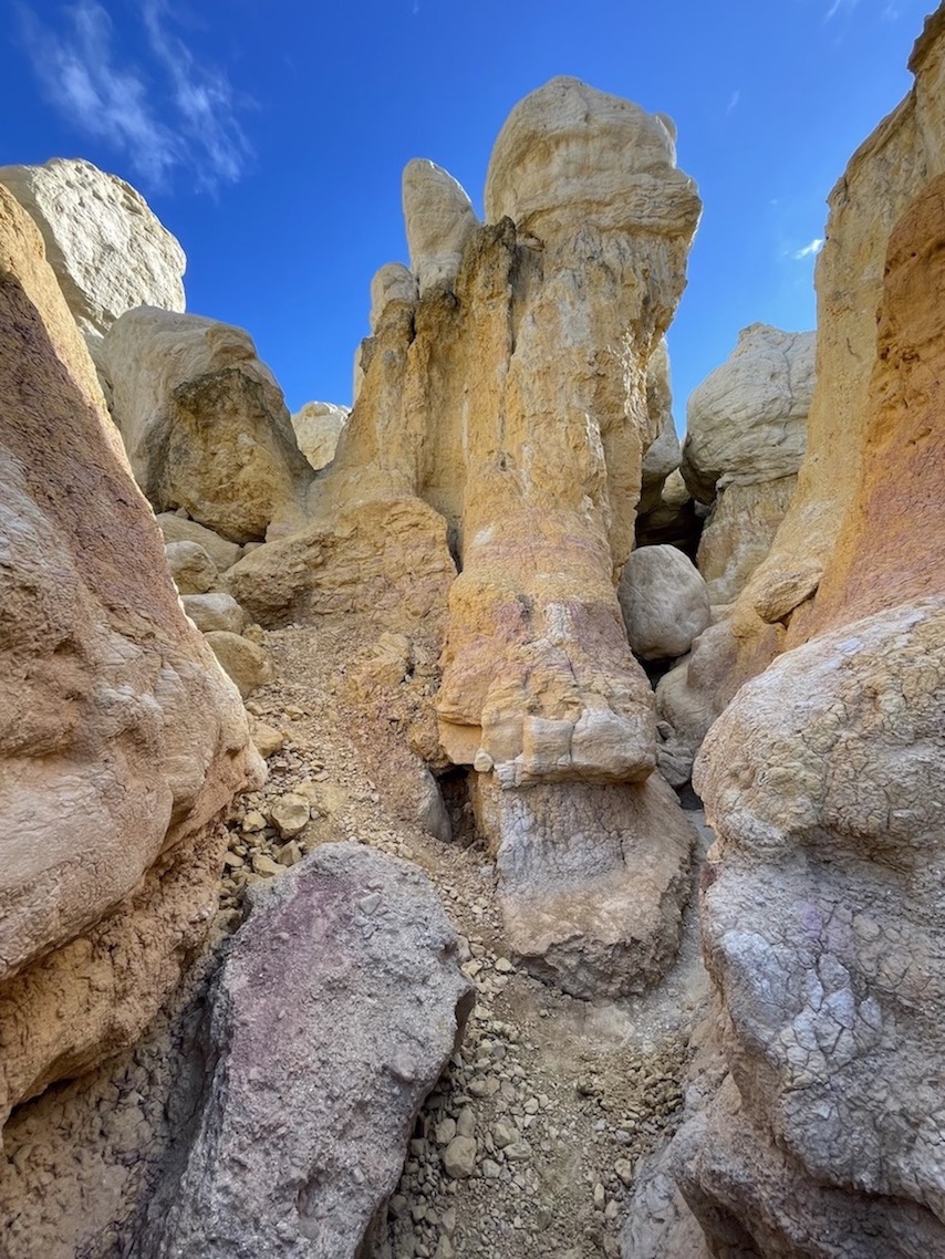 Since Paint Mines is not a national park or state park, it’s not over touristed. When I arrived in the morning, there was only one other car in the small pull-off parking lot and I had the trails to myself, though many more cars arrived by the time I was done exploring. It’s in the middle of nowhere in a vast, extremely windy plain. All you can see for miles are windmills and a few homes scattered amongst the prairie, so you’d never guess that there is a network of colorful hoodoo rock formations hiding a short walk from the parking lot. If you showed me pictures of Paint Mines Interpretive Park but didn’t tell me where it was located, I’d have never guessed Colorado. I was reminded of the geology in Chiricahua National Monument in Arizona, Bisti Badlands in New Mexico, or Artist’s Palette in Death Valley National Park in California.